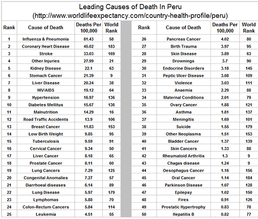 But what really caught my eye, and the main reason for this blog post, is that when you look at the US Top 10 just notice that Alzheimer’s/Dementia come raging in at #2. Now check out all 50 of the leading causes of death in Peru. See any hint of Alzheimer’s/Dementia anywhere in the top 50. And I do mean any hint – perhaps Alzheimer’s/Dementia are called something else in Peru. Checking. Checking. …. Nope, not a hint.