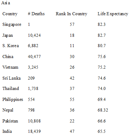 You may be as surprised as I was. I went to a website that gives comprehensive WHO data on the leading (top 50) causes of death for each country, and here is a sample of what I found. I didn’t include data for every country in the world – you can go to the website if you’re curious about a country not listed here.