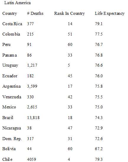 Second, although most of the countries listed have fewer people than the US, the “Rank In Country” number levels that playing field. The “Rank” indicates the number of Alzheimers/Dementia deaths per 100,000 population, which corrects for differences in the absolute numbers of people between countries. When we see that Alzheimers/Dementia ranks #2 in the US and #60 in Peru, for example, it is irrelevant that Peru has far fewer people than the US.