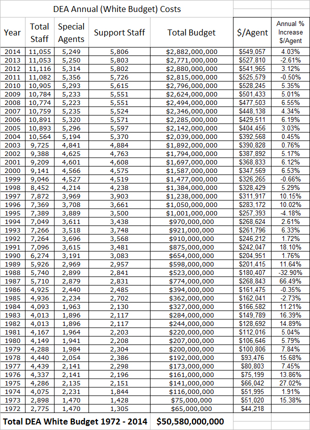 A quick glance at the “White Budgets” of the DEA reveals that over the course of its existence, 1972-2015, the DEA has cost just over $50,000,000,000 (Billion) in tax money extorted from the American people. I call the figures below the DEA “White Budget” because they reveal only the above-the-table allocations by Congress for this gang of Storm Troopers – not the hidden “Black Budget” which cannot be known, but which is probably at least the equivalent amount. That would suggest a 43 year total cost – just for the DEA – of $100,000,000,000. That’s a lot of living-wage teacher’s salaries, women & child health clinics, orphan diseases research, merit-based college scholarships, and other useless shit that we are continually reminded have to be sacrificed to pay DEA agents and bureaucrats to keep our kids safe from drugs.