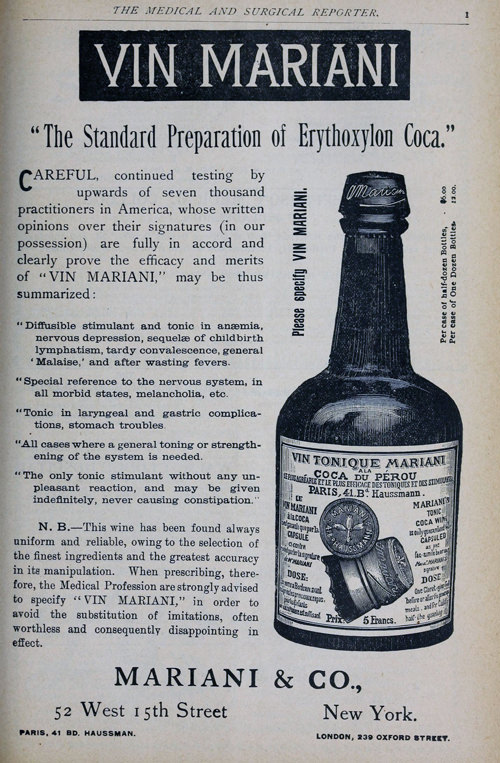 Vin Mariani “This is the first of the preparations of Coca and the one most generally adopted; to the tonic and stimulant action of the drug there is added that of a choice quality of wine. The Vin Coca Mariana contains the soluble parts of the Peruvian plant. The combination of Coca with the tannin and the slightest trace of iron which this wine naturally contains is pronounced to be the most efficacious of tonics. The Coca leaves that we employ after careful selection come from three different sources and are of incomparable quality. It is this that gives to our wine that special taste and agreeable aroma which renders it so acceptable to the sick.”