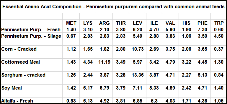 Animal feed values for Pennisetum p. are shown in this table.
