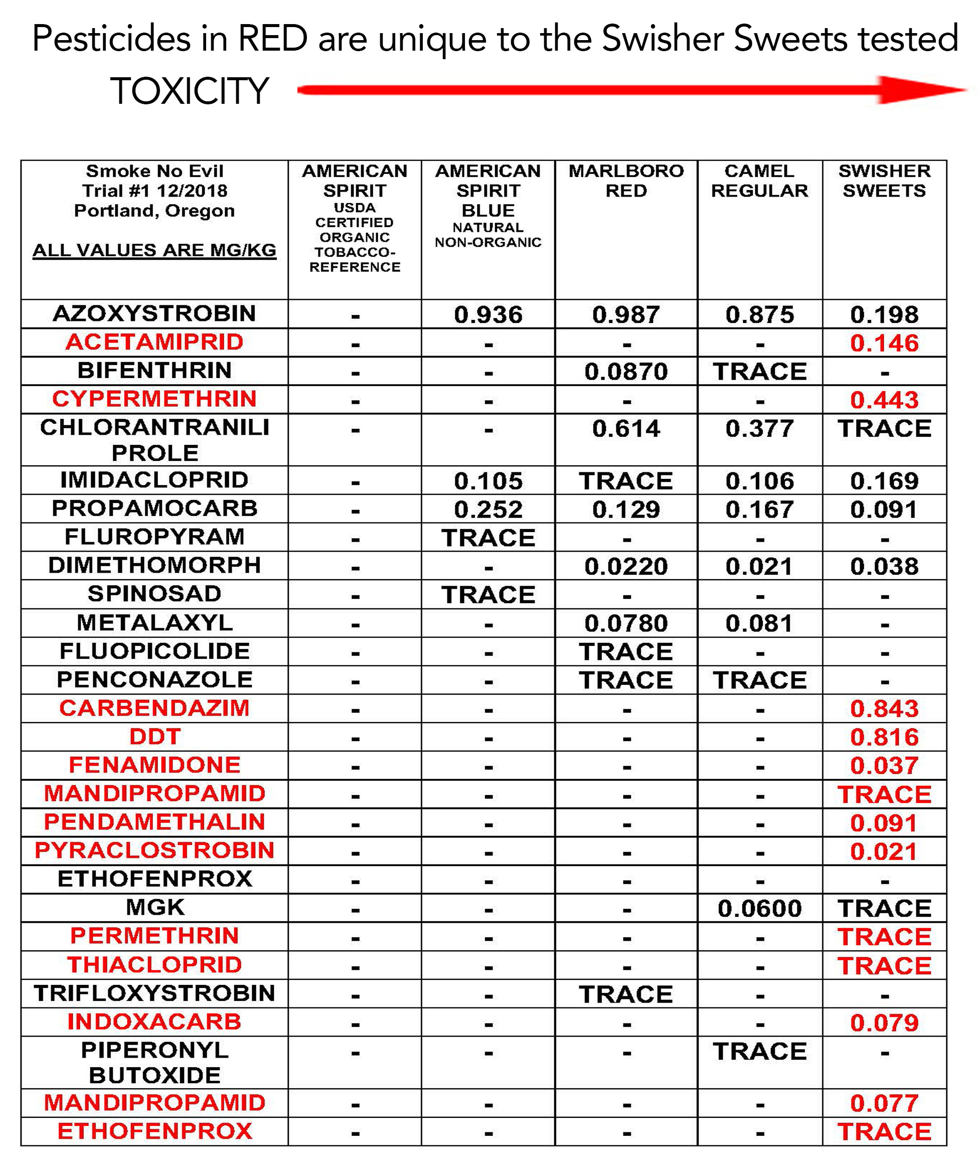 The DDT you see in the table below, all 0.816 mg/kg of it, is fresh, potent, and highly reactive, not just trace soil or water residuals from 50 years ago. It was sprayed directly, heavily and very recently on the tobacco used to make Swisher Sweets. There is a total worldwide ban on the use of DDT on crops, by the way. That’s another story, which I document in my book “Smoke No Evil“.