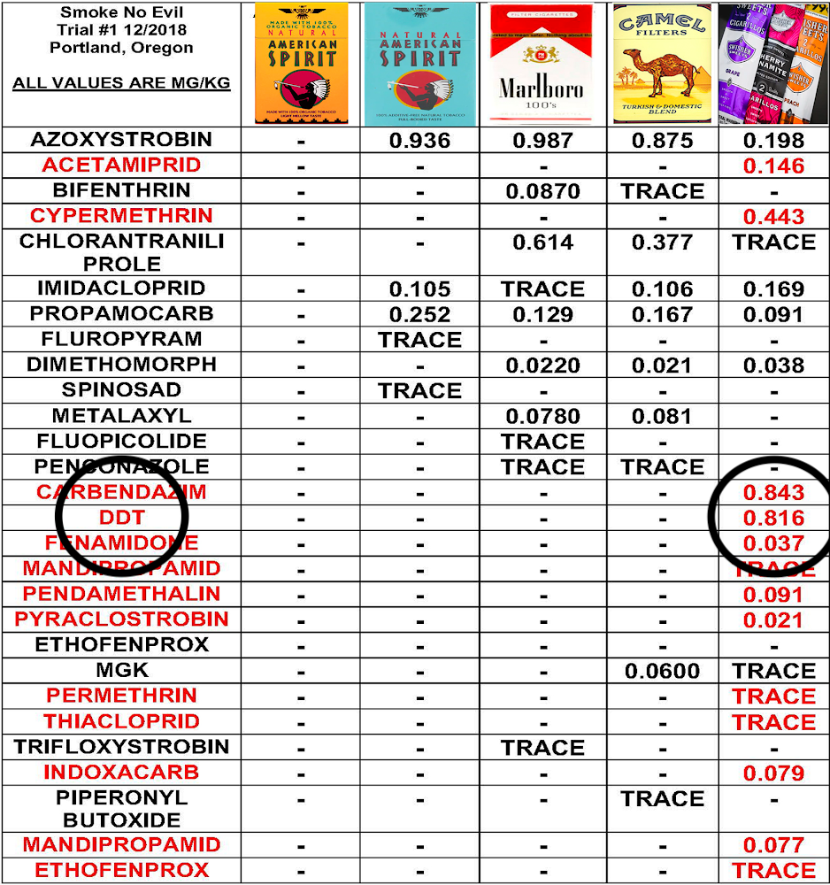 Were you ever informed that, as you can see, nearly all commercial cigarettes expose smokers to pesticide residues? More importantly, were you ever made aware that there are pesticide-free tobacco options available that reduce harm from smoking by eliminating pesticide exposure? Did you ever see any Surgeon General’s warnings about inhaling pesticides from smoking? Note: you didn’t, because the Surgeon General, for some reason, has never mentioned pesticides in all their 50 years of propaganda about smoking.